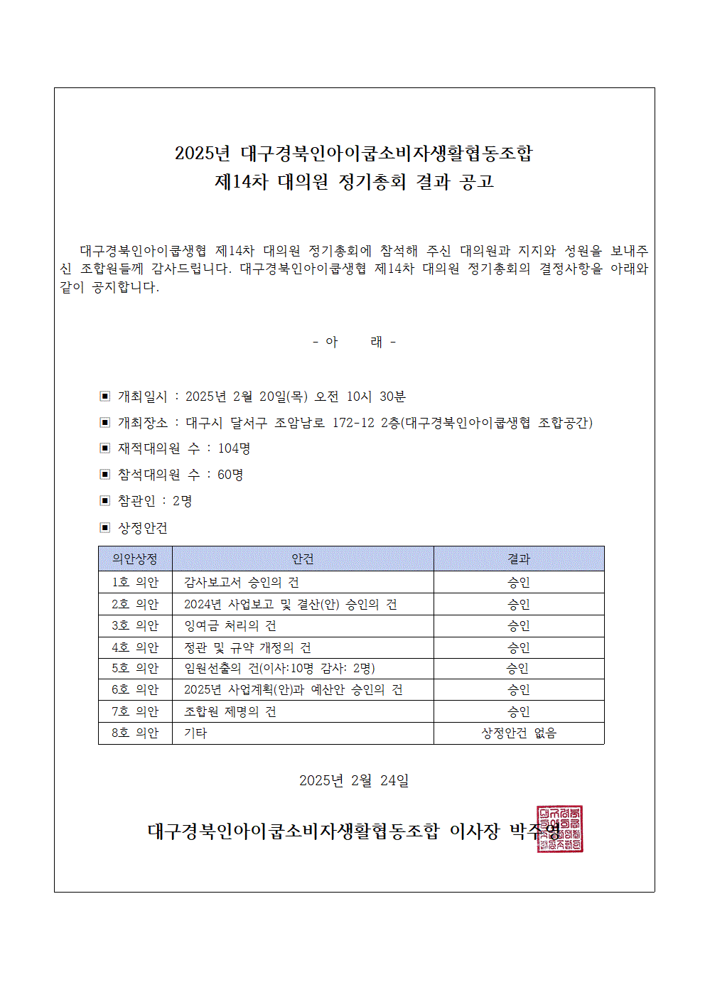 2025³â Á¦14Â÷ ´ë±¸°æºÏÀξÆÀÌÄò»ýÇù ´ëÀÇ¿ø Á¤±âÃÑȸ°á°ú °ø°í