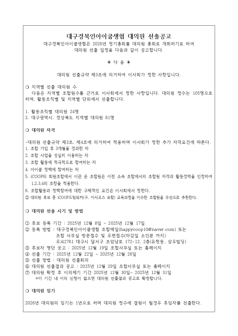 26³â ´ë±¸°æºÏÀξÆÀÌÄò »ýÇù ´ëÀÇ¿ø ¼±Ãâ°ø°í